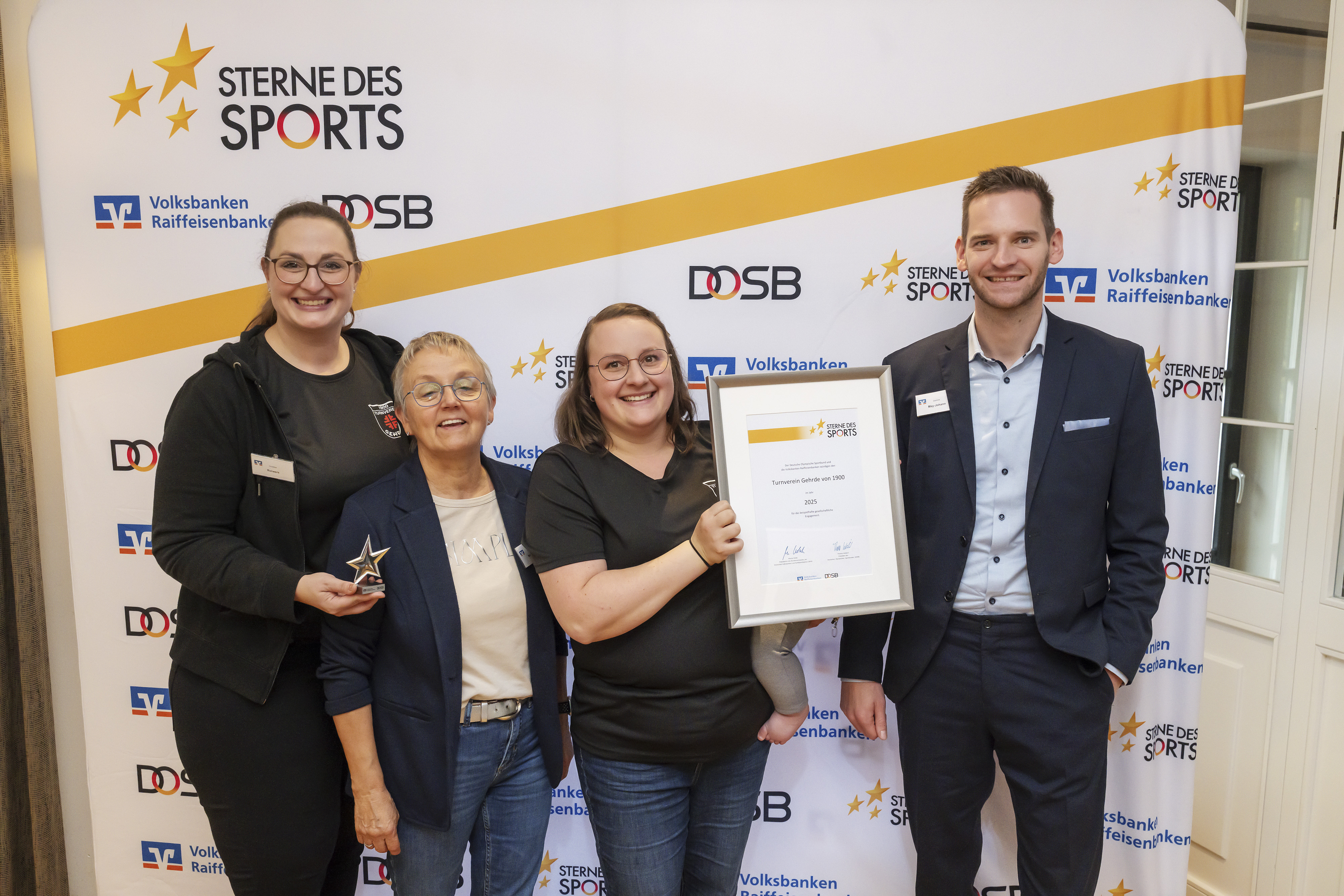 Im Jubiläumsjahr erhält der TV Gehrde von 1900 den kleinen silbernen Stern des Sports: Christine Rolwers, Brunhilde Moormann und Carmen zur Stadt, TV Gehrde mit Dominik May-Johann, VR-Bank eG Osnabrücker Nordland (v.l.)